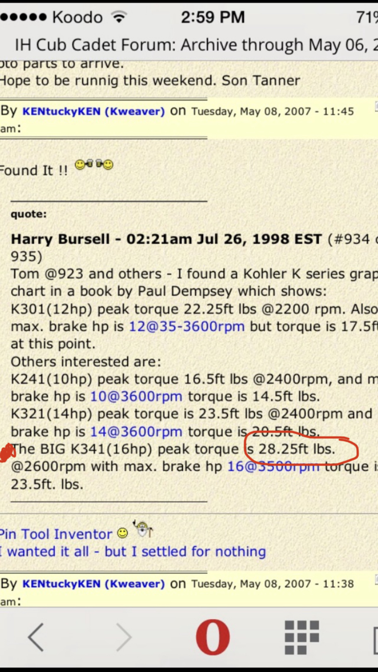 Kohler K341 16 hp at 3600 rpm, 28.25 ftlb of torque at 2600 rpm.