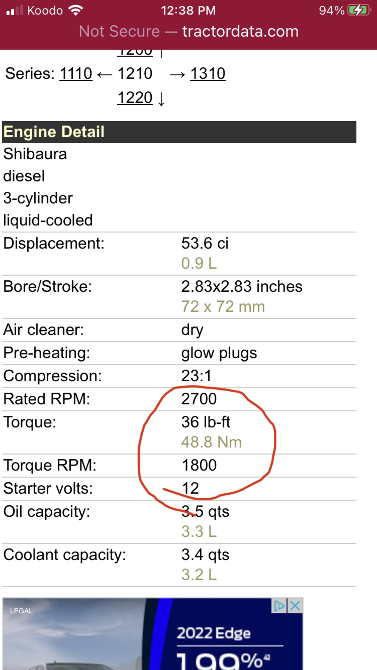 Shibarua engine, 16 hp at 2700 rpm, 36 ftlb of torque at 1800 rpm