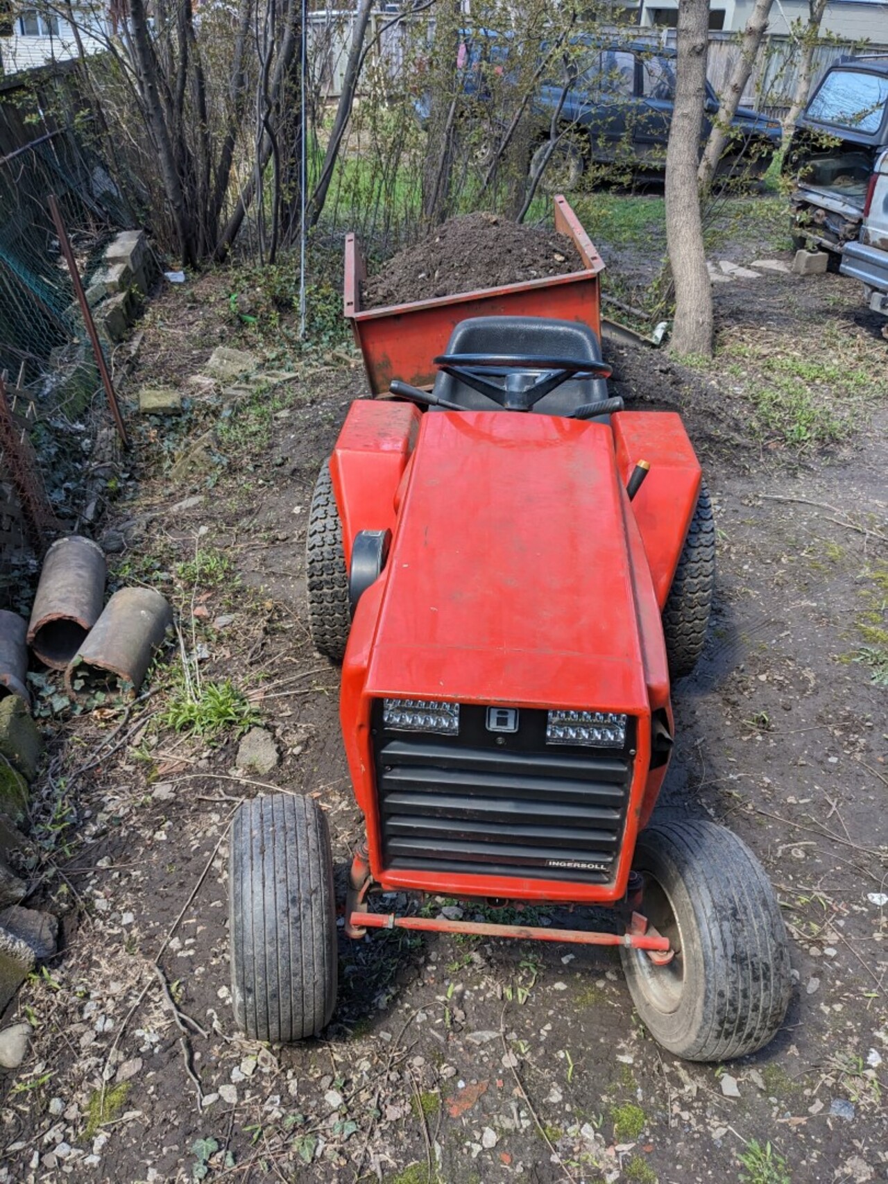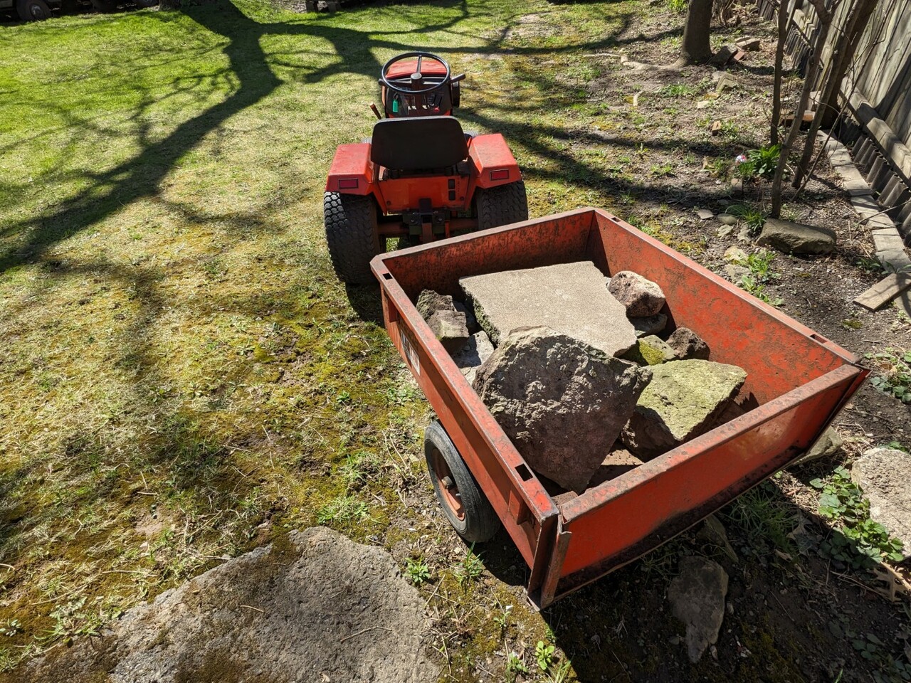 A lot more fun (and easier) than using a wheelbarrow, and I can see how it will be easier to wiggle in and out of tight spots when it gets up north to the property.