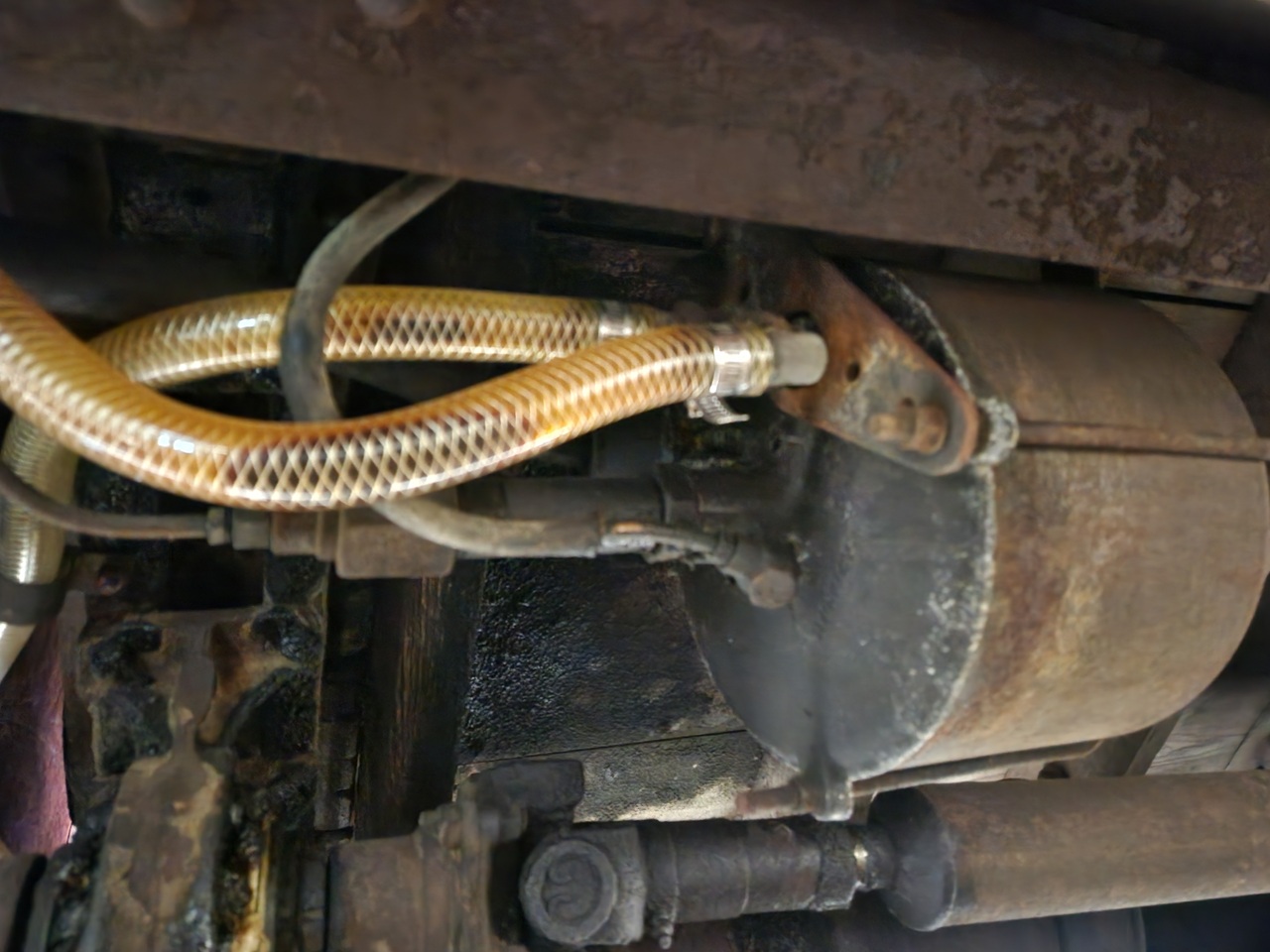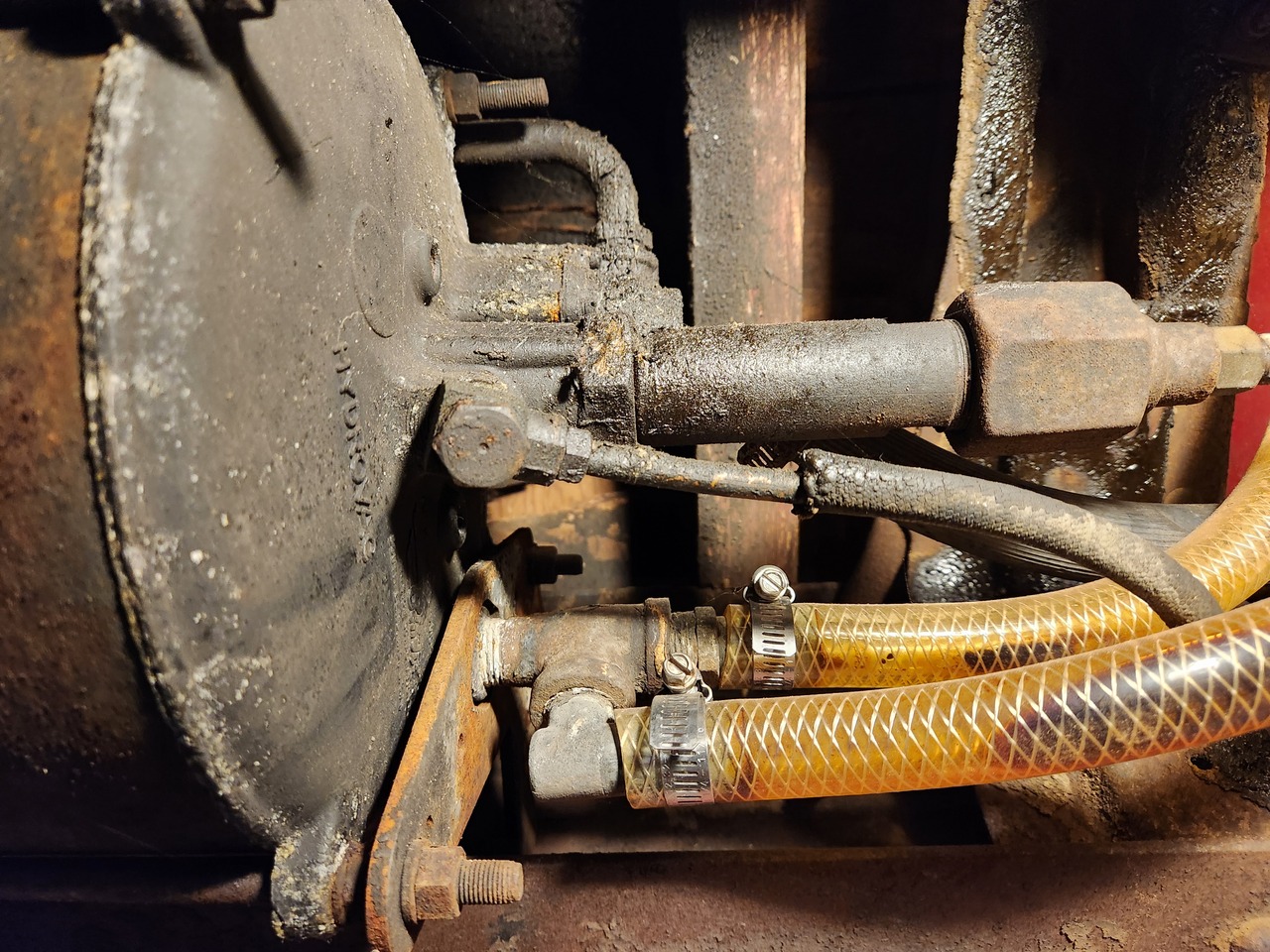 Most of the fuel lines are steel. I haven't traced all the way from the tank to the fuel pump, but it leaves the tank in steel, runs to a tee in the frame to split to the crane, and at some point it goes to a soft line that supplies the 361's fuel pump. It's all thread fittings, or I would have changed the soft section, because it feels really soft at this point (as does the crane's fuel line). I have to see what fitting I need back at the tee to go to all barbed, or I have to come up with the correct crimped hose. The carb is filling to the right level, so I'm less concerned about this though.