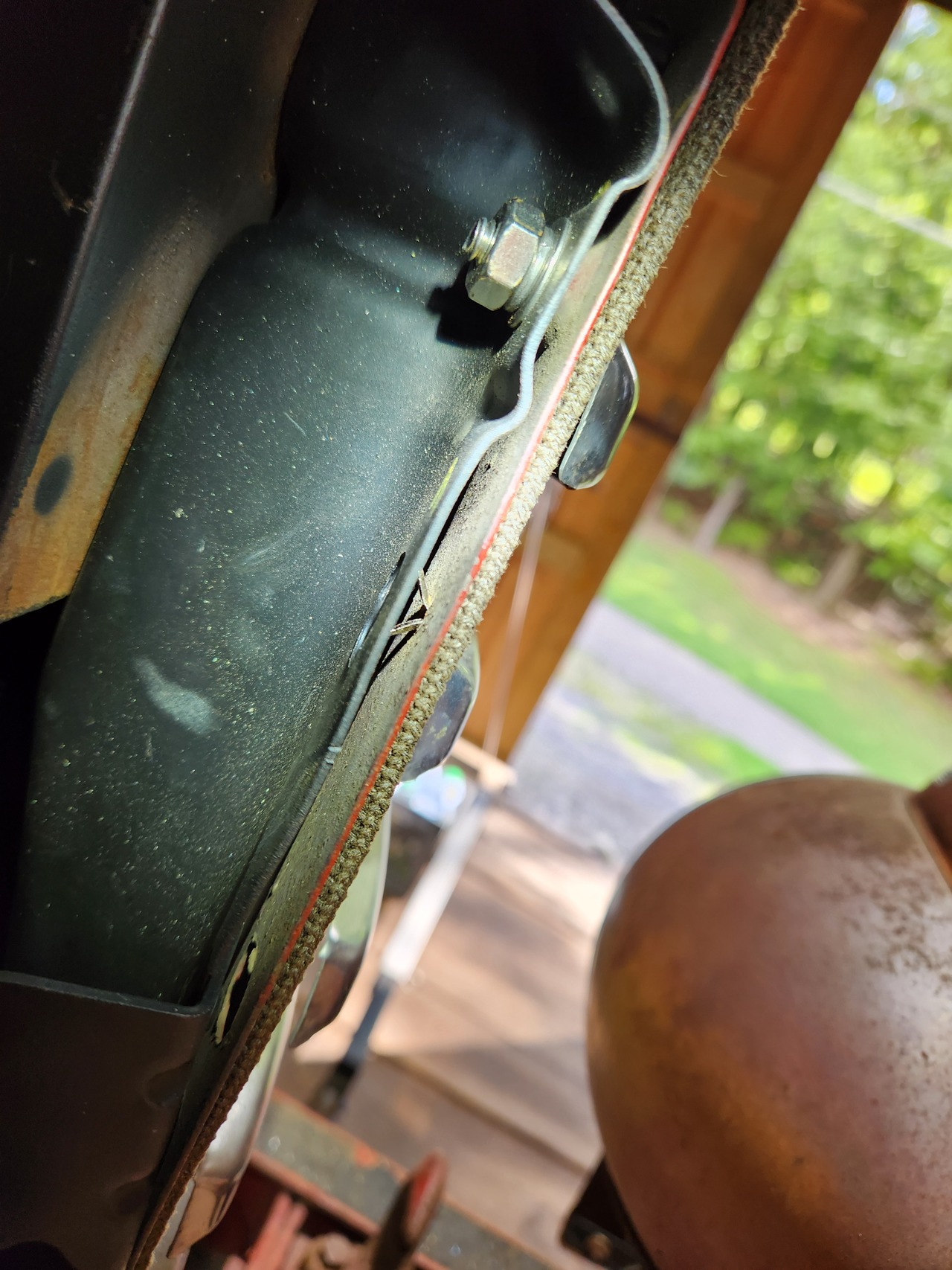 This mower has seen some use, and a lot of years... The design is kinda problematic as it collects grass on the back of the deck, with no place for moisture to drain out. So, you can see nature has added some drainage to take care of that... Shavings build on the bottom in this area too, so it's probably inevitable on this model.