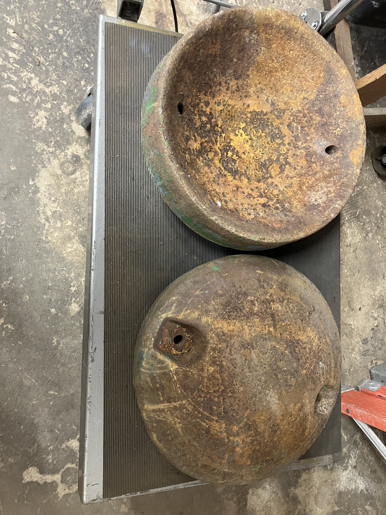 I picked up a pair of JD wheel weights today. I asked the seller if they came iff a combine. He told me he thought they were off a tractor. They are supposed to weight 135 lbs each, but I have not put them on a scale.
