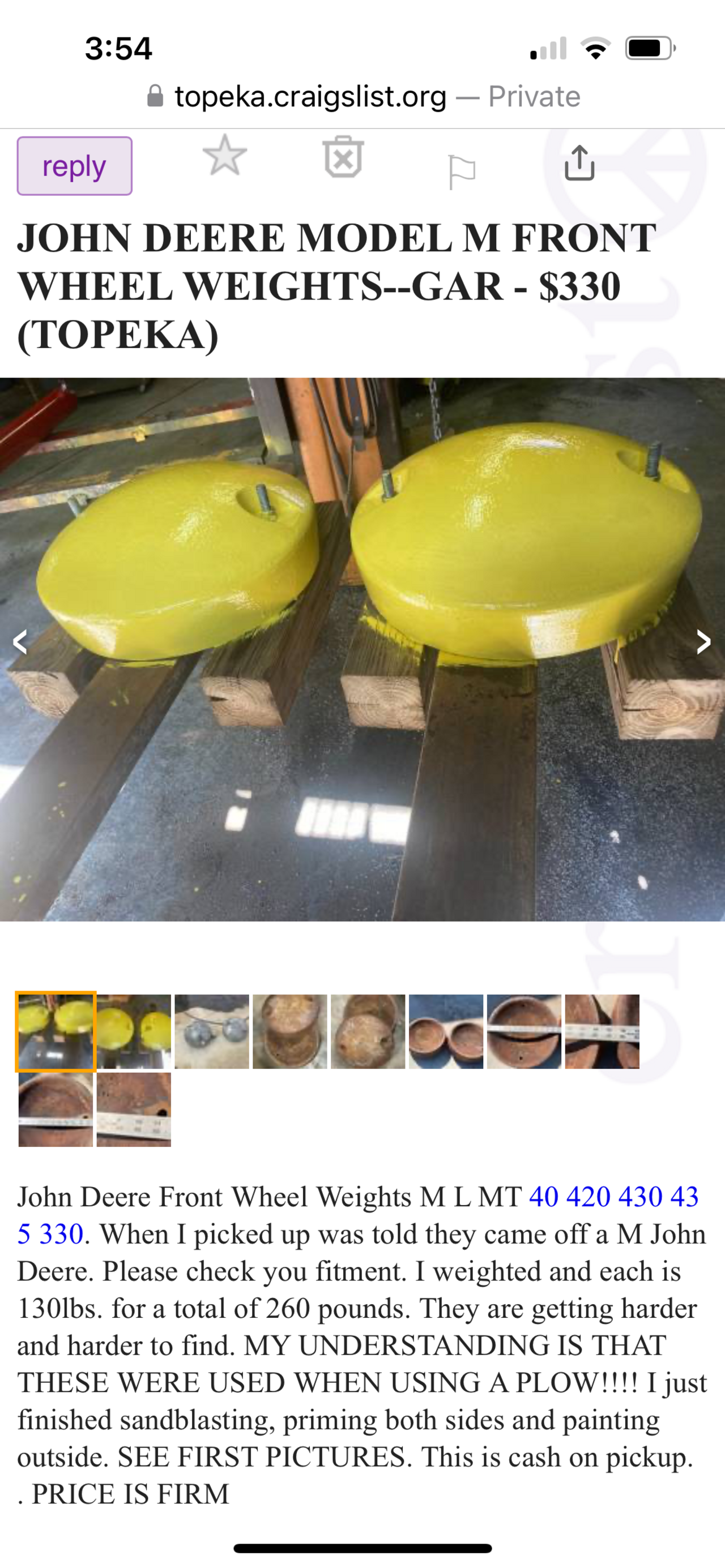 The seller told me he saw a set on Marketplace somewhere for $400. I paid $200 which is less than a dollar a pound which is good in today’s economy. He had some one offs also at a reasonable price but I wasn’t interested. Not sure yet where I’m going to use them. The 446 snow machine has two piece weights. Each weigh 40 lbs so eighty per wheel or one sixty total. One thirty per wheel for two sixty total. That would be one hundred more total.