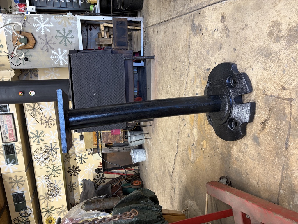 Phase one complete today. I’ll have to do multiple posts as this progresses. This is a movable stand for a large vise or maybe my beverly shear. Instead of mounted on a table the stand will provide access all around what ever I have in the vice. The base is a big tractor weight that I picked up in a bundle deal when i purchased the end cap weights that I installed on the 646. The post is a scrap pipe left over from a job I did for a plating company. It was a hydraulic line that a employee over charged a line. Can you imagine the pressure on this 4” schedule 89 pipe. I cut the flanges off and welded them on another pipe. Then they bent another one. So I did a second one. I took the least bent pipe for the post. The top plate was something that has been on the weld table for years. A sleeve inside the tractor weight goes inside post so no welding on the weight. Top plate was drilled and tapped fir 1/2” bolts. Next post it should be completed.