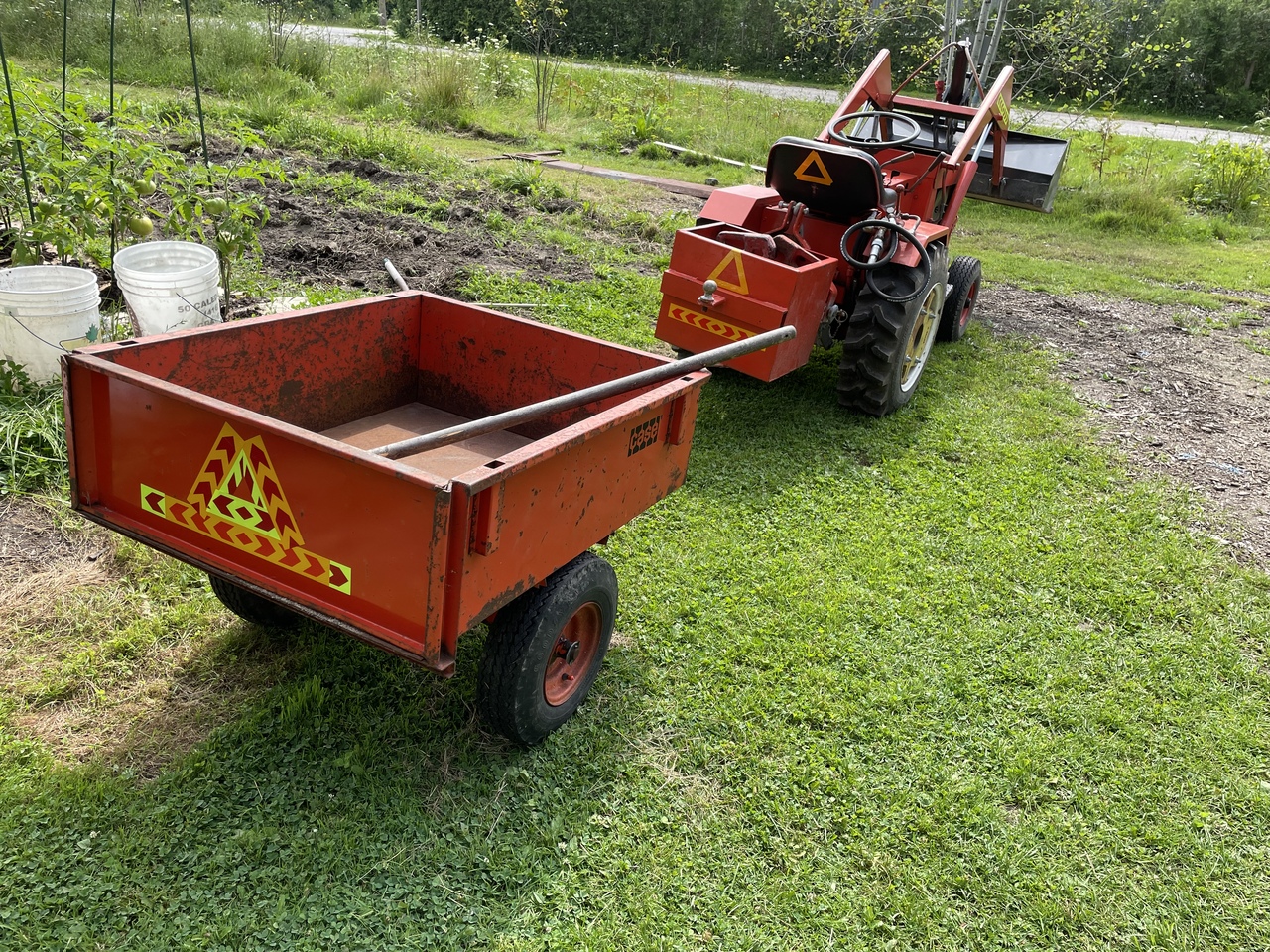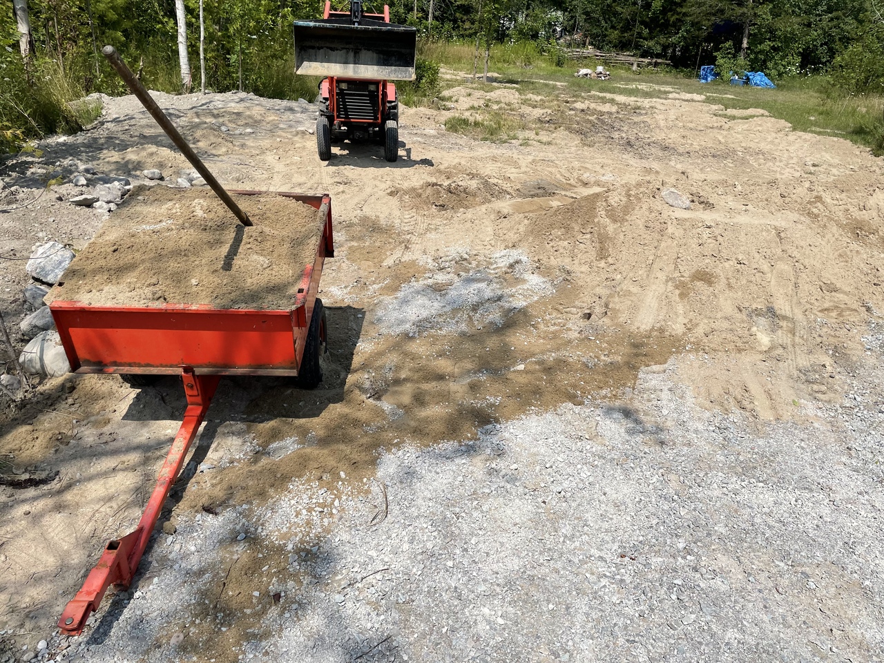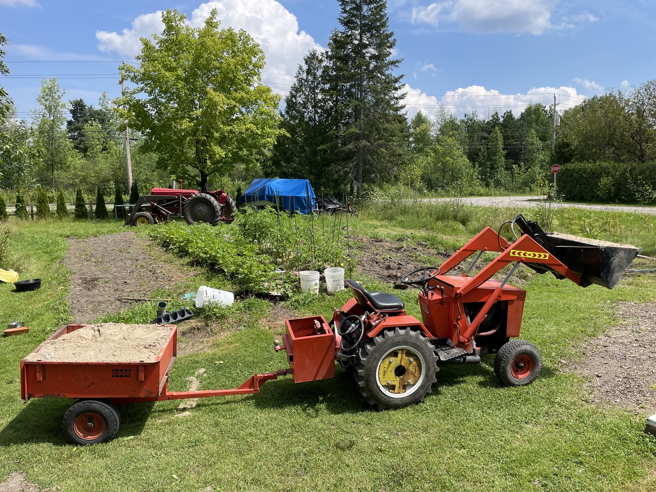 Neighbour bought a vacant lot about a mile away. Swampy place so he had some sand delivered. Showed up asking if he could borrow the loaded after he tried spreading it with shovel and wheelbarrow. He had his fun and said I could take some of the sand for our children sandbox. I was going to get myself a trailer of sand anyway from the local sand and gravel people but it's a little easier to get it from the neighbour. Have to go on the side of the road to that place so I hot the cart and tractor road ready with some reflecting tape. More action pics to come