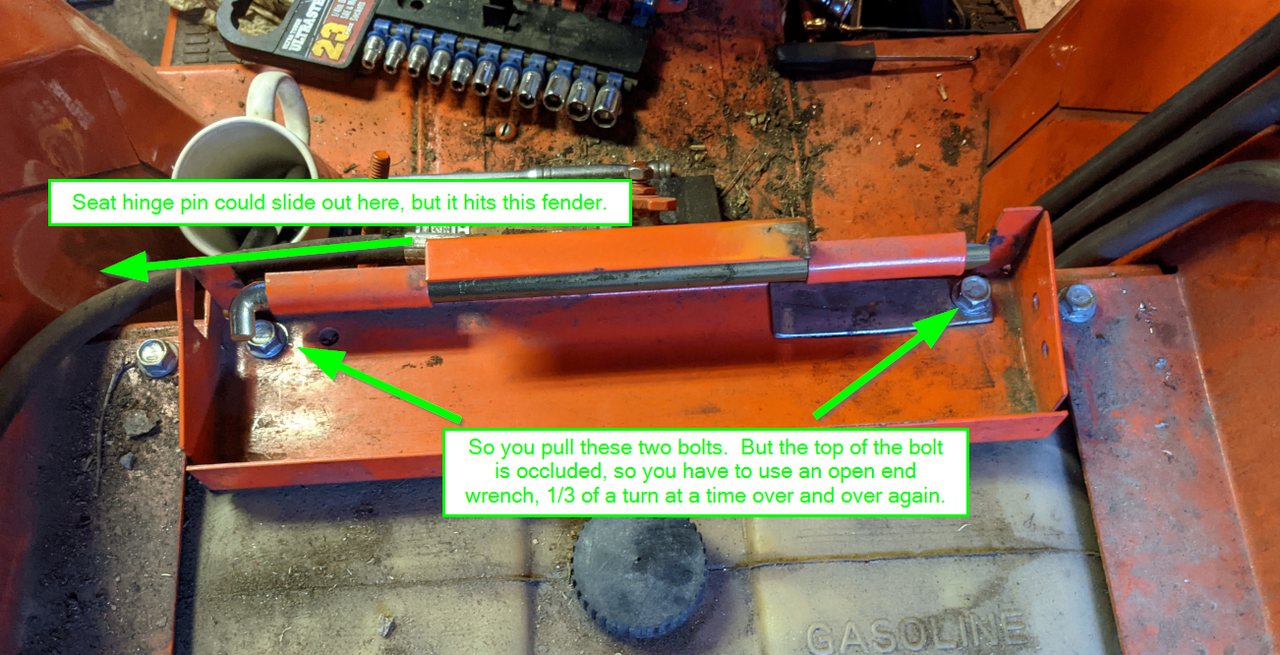 I find it frustrating the way Case/Ingersoll attached the seat to the tractor. It fills you with false hope, only to let you down when you find that, not only do you have to "do it the hard way", but the hard way is extra hard!