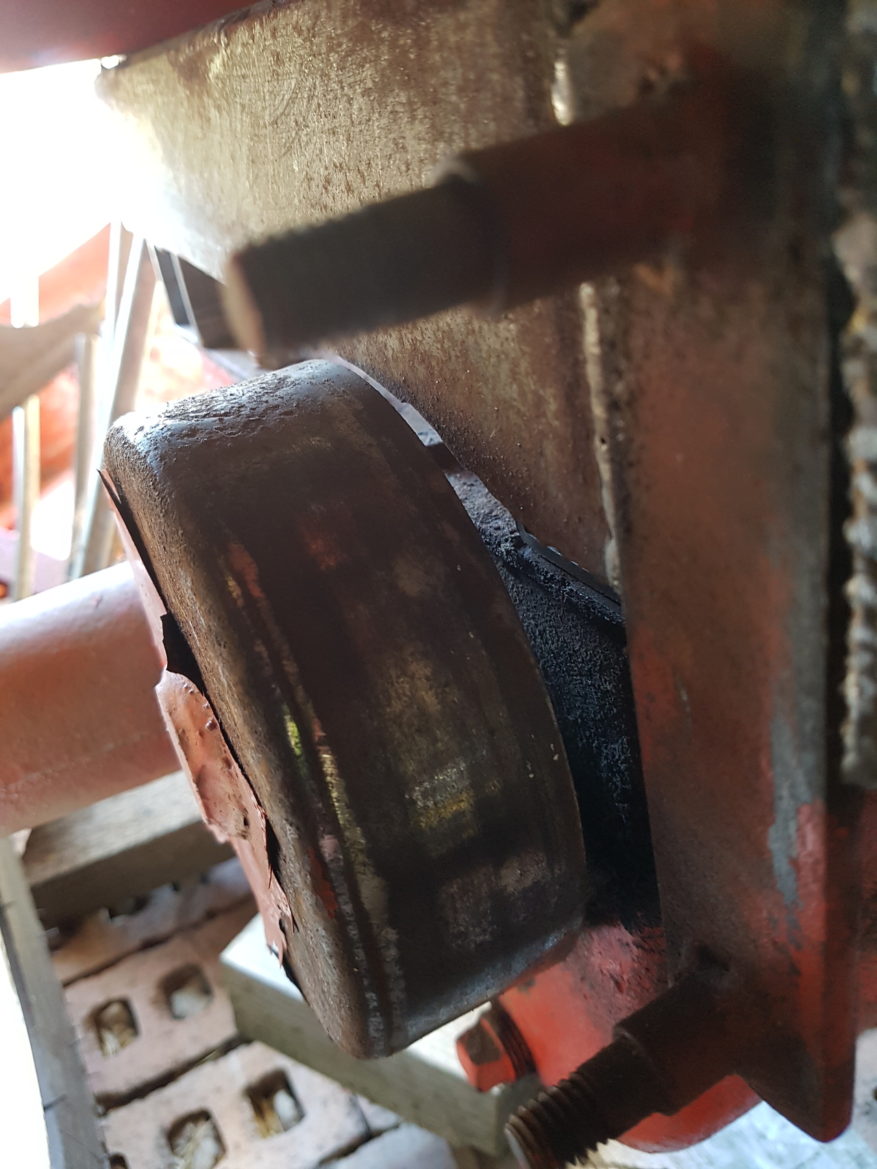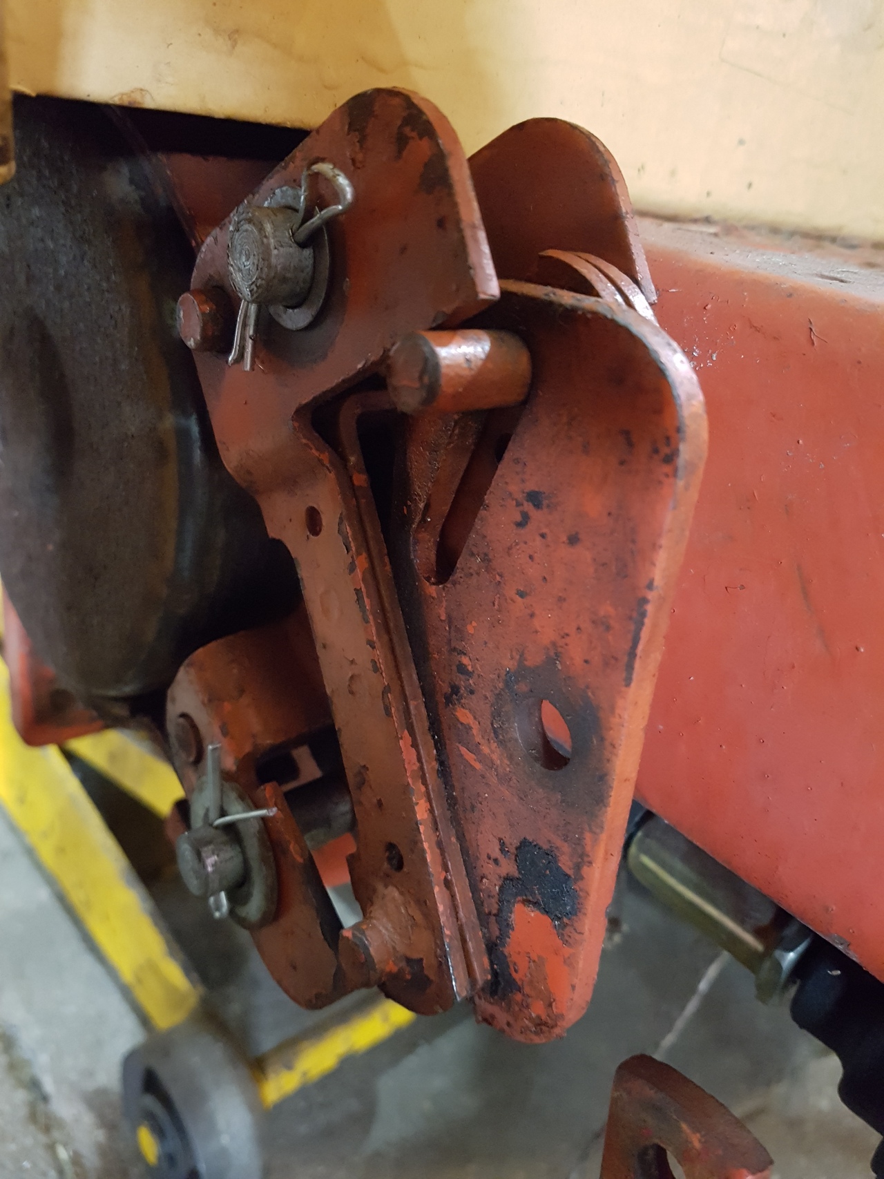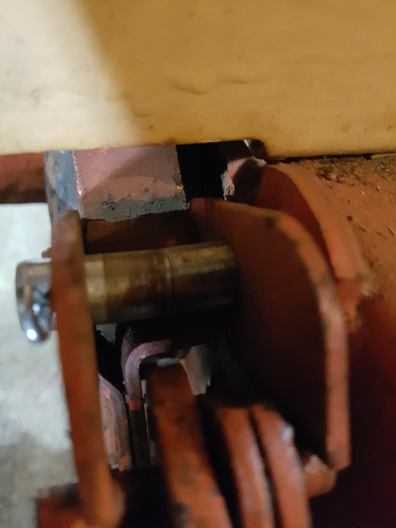 Brake band , from old style to new style . Problem , I have 3 old style bands and hardware with no lining on them . Don't have the time or the money right now to order new linings . But I have a new style with about 60% material left on it and all the hardware from converting Frankie to disk brakes ,Plus i think the newer design is better . I am working on a 446 short frame to be a dedicated front mount snow blower . How to make the new work on the old without re-engineering the whole thing . After looking at the 2 systems closely the old mount just needed to be sleeved . So , 1/2" rod from scrap bucket . Drilled 13/32" 1/4" deep then 5/16" 1" deep tap to bottom part off at 1 1/8" long for the top one and 1 1/2" long for the bottom one . Cross drill 3/16" from end 3/32" hole for cotter pin , back up with washer to reduce wandering . Like me you may have to "adjust" ( with a socket and hammer ) the top pin assembly to get the brake band to sit in the centre of the drum.