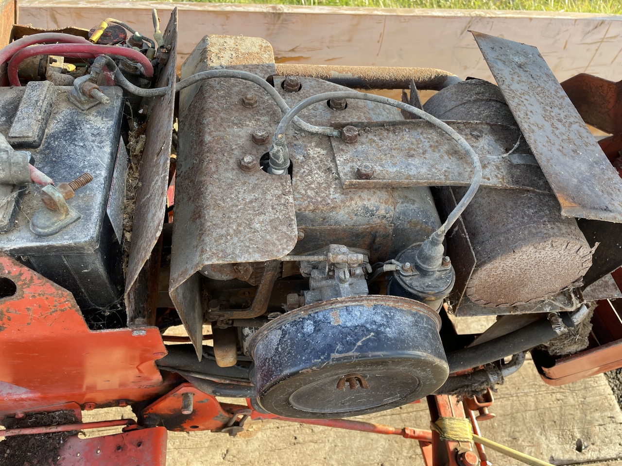 Carb is stuck in open position, needs overhaul. This little guy sat for many years. The rims got almost no paint left, surface rust has won the battle. Seat rusted through, and upholstery all ripped; unusable. On the plus side, the steering wheel is good.