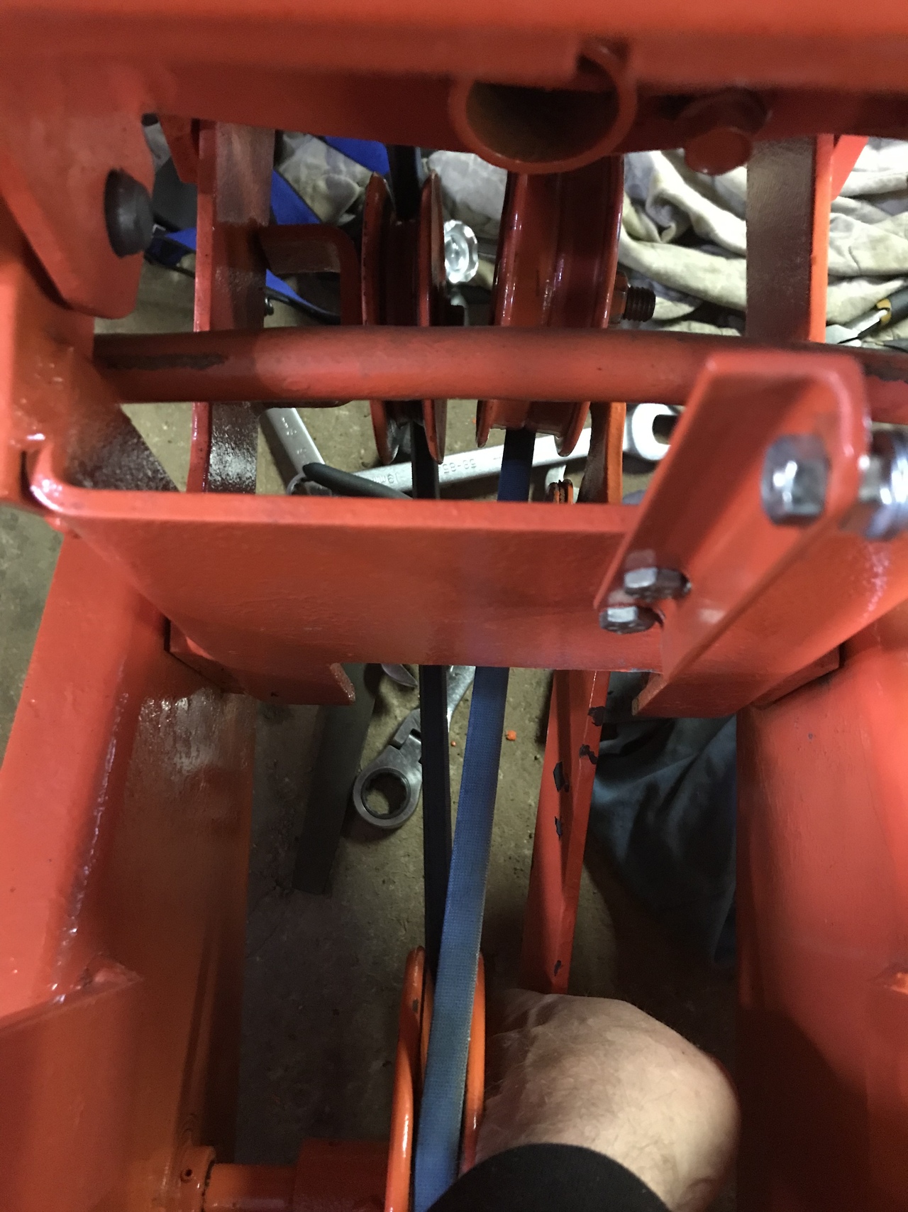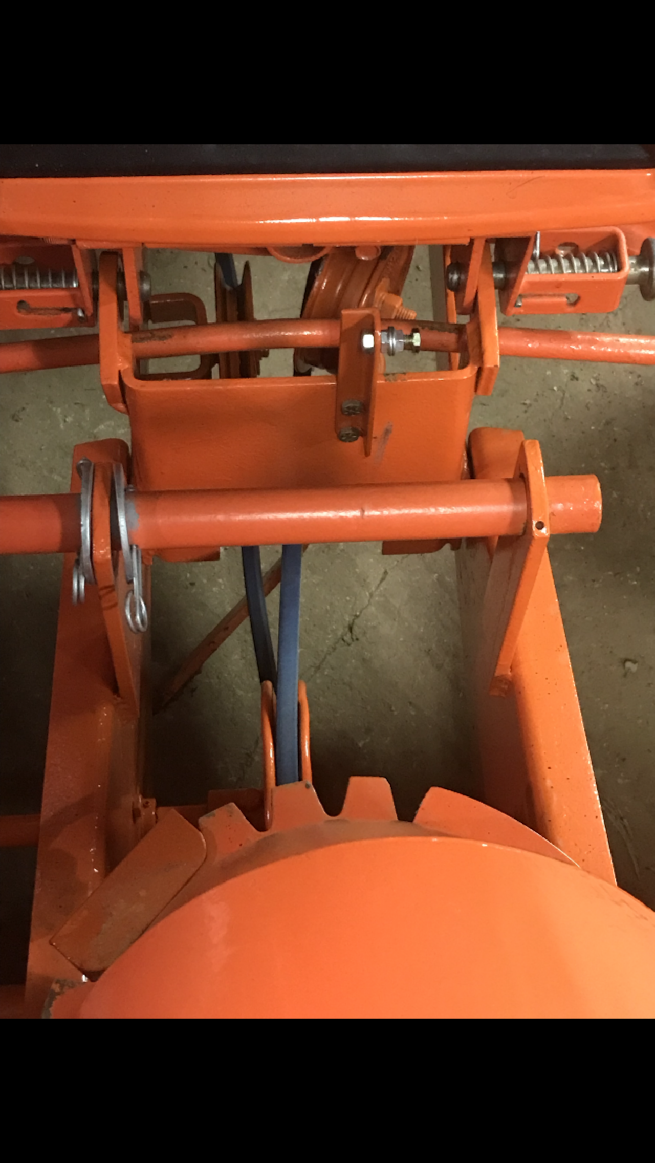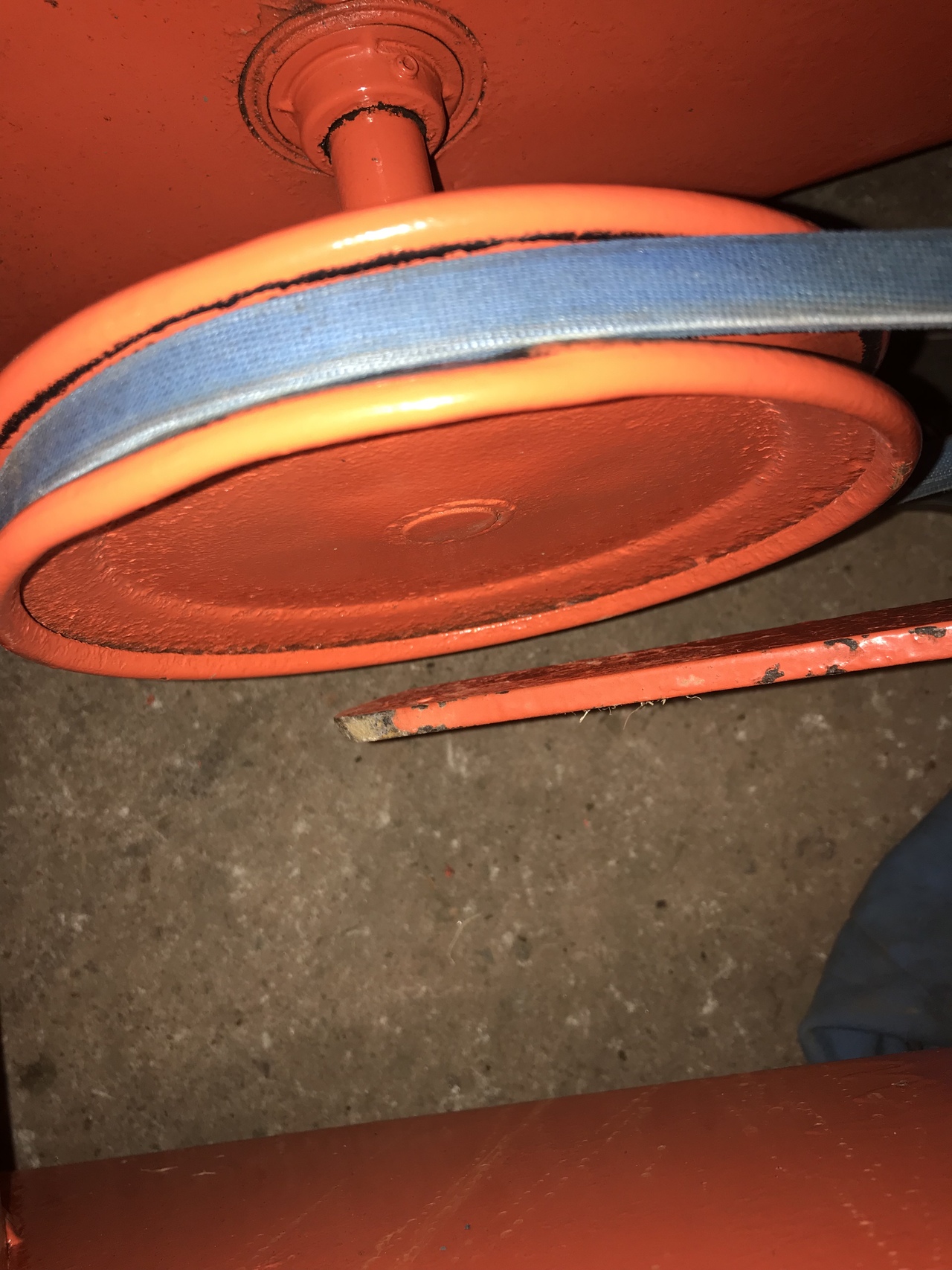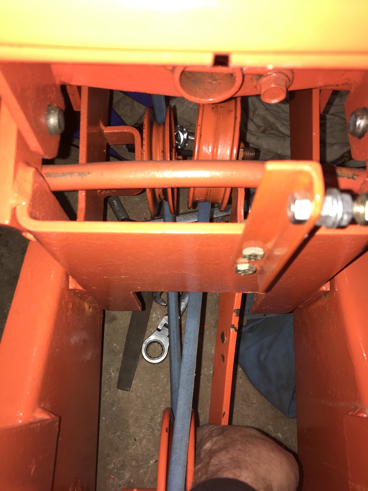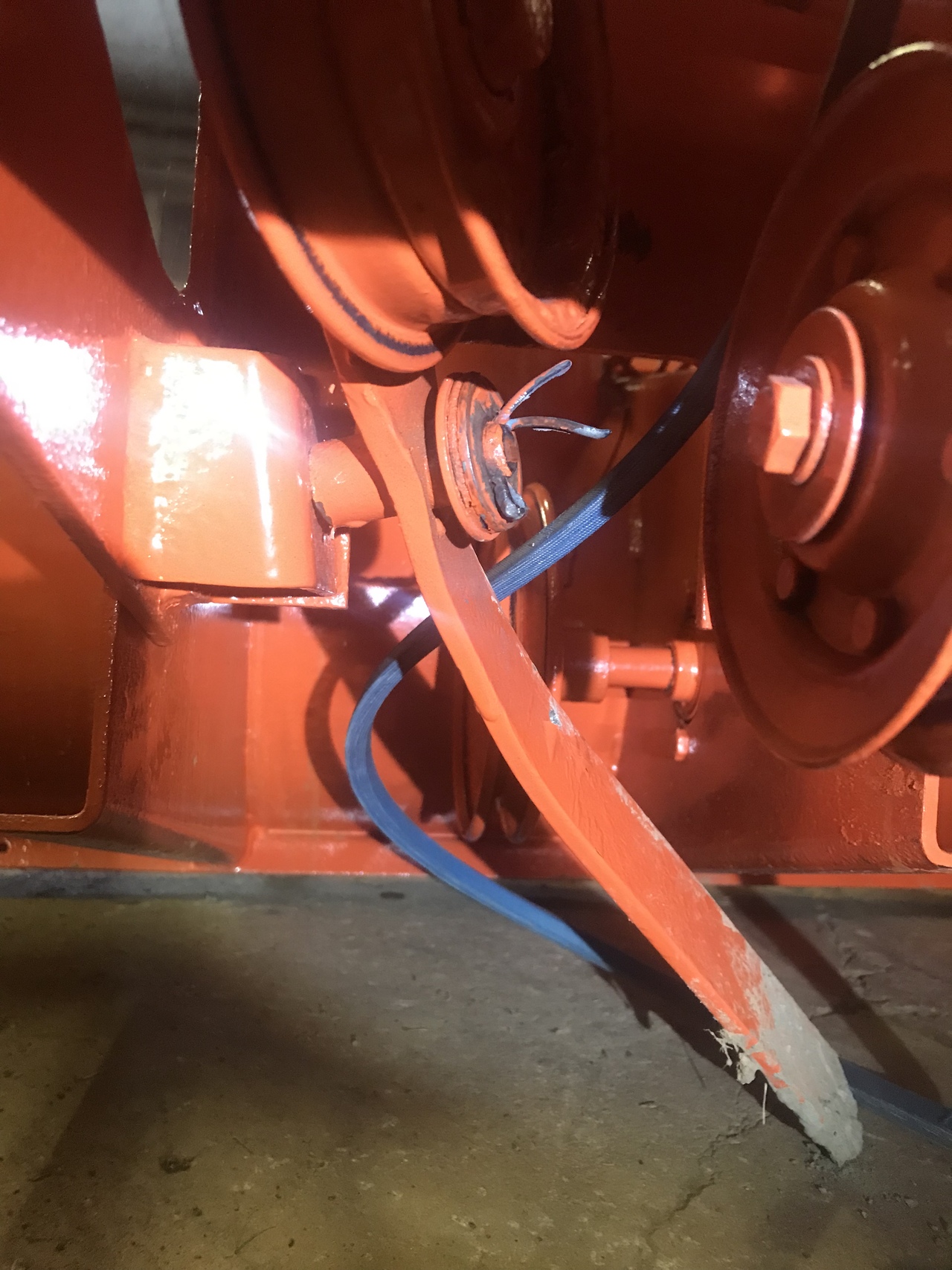 So guys, I straightened the arm and the pin on the tractor. Put the belt back on. No spring on yet. Cotter pin just set in pin to hold arm on. When I pull up on the arm, like the spring does, the forward end of the arm is about 3” off the ground. So is this correct ? 81” belt is installed. If I put a longer belt on, that would raise that arm at the front, but will it make the belt roll of the drive pulley because of entering the pulley below top centre ? If I put a shorter belt on, that will make the front of the bar closer to the ground. Don’t want that ! So do you think the engine pulley, stationary v pulley and idler pulleys are the correct size. Who knows what has been done and what parts have been changed in 40 years.