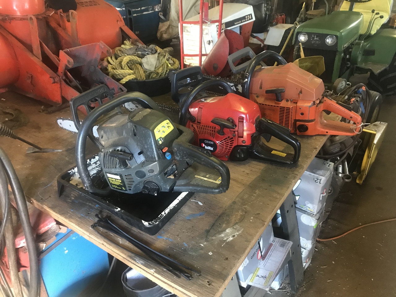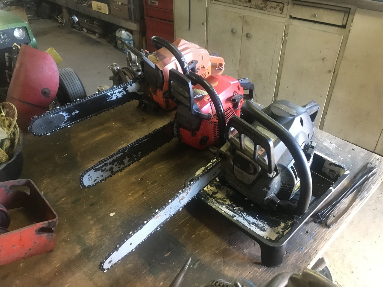 Any way, chain sharping is the main thing on the Poulan and RedMax. And start them.