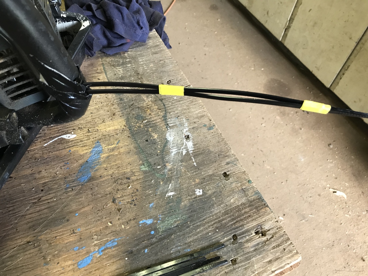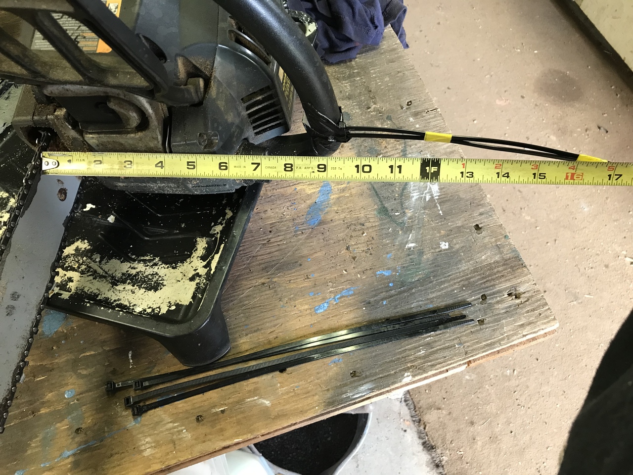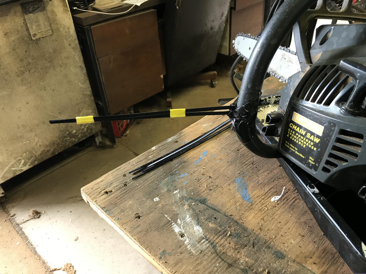 and as a testament of how our two great countries get together so well, the saw worked real nice with that oil!!! A little trick for measuring your cuts. I just put this on, so have not tryed it. A fella on you tube does this. So the twist ties are measured to what ever length of log you want. I like around 16/17”, so a piece of yellow tape to measure that. The other yellow inside tape is at about 12” inches. So I have to cut four cord at 12” or so and the rest at 16/17”. Twist ties are flexible enough that they may not get in the way. Once I git to cutting wood, I’ll see how it works.