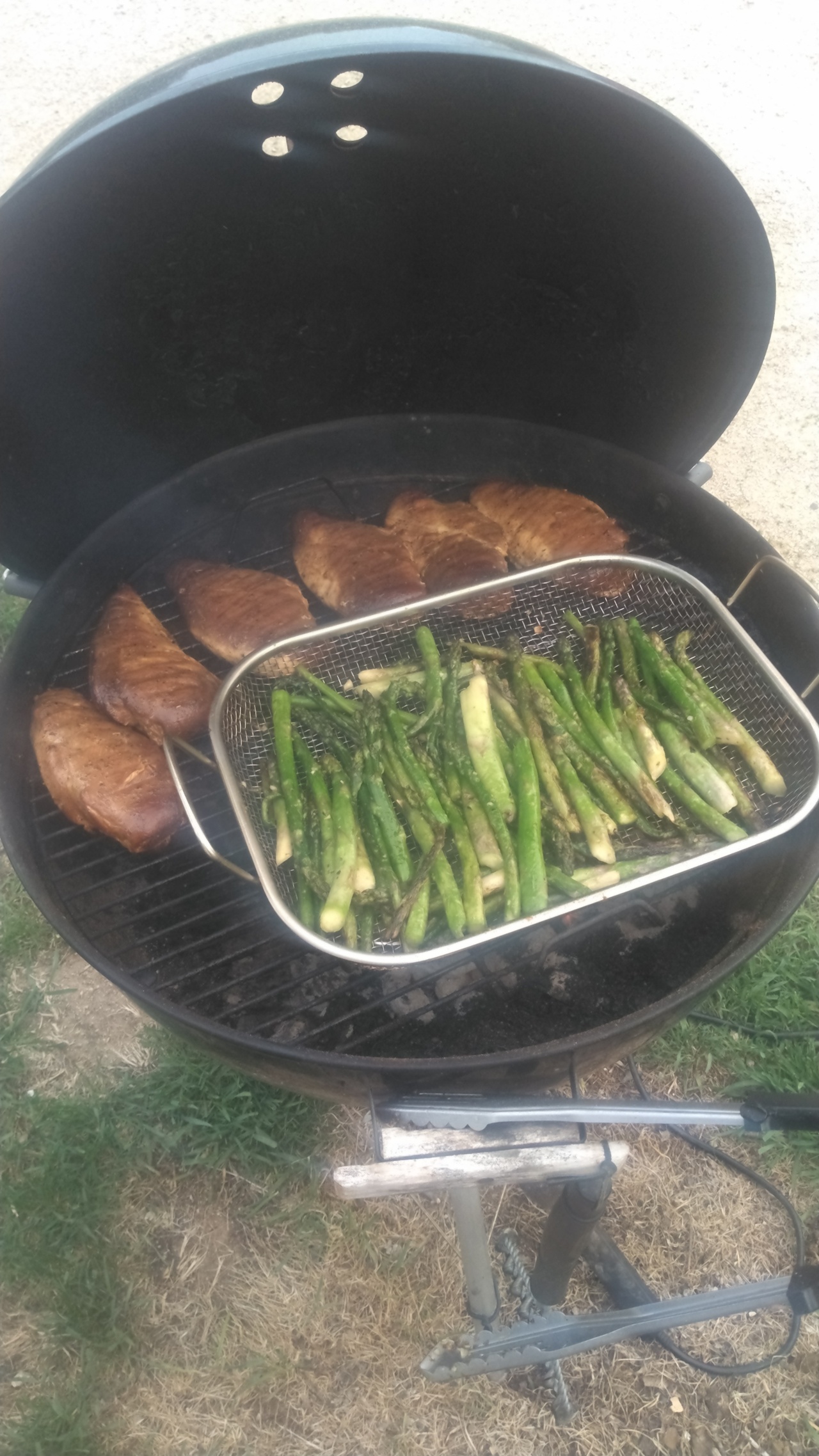 Cherry smoked chicken breasts and fresh grilled asparagus.