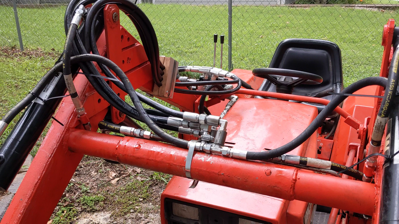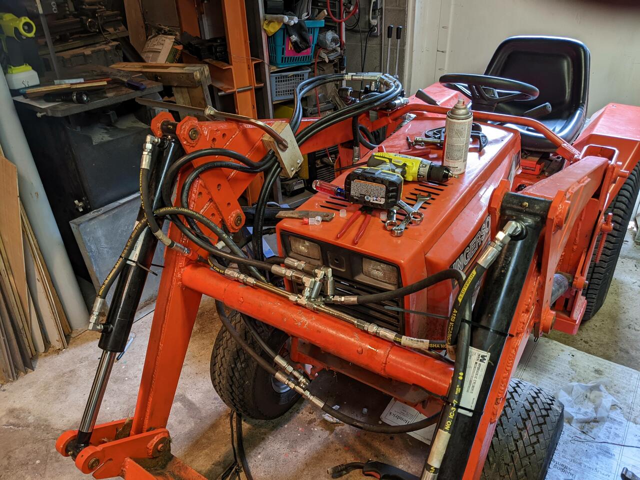 So I have the first two hoses run and piped into the boom lift cylinders. So naturally, I backed the tractor out of the basement workshop and started it up to see what would happen.