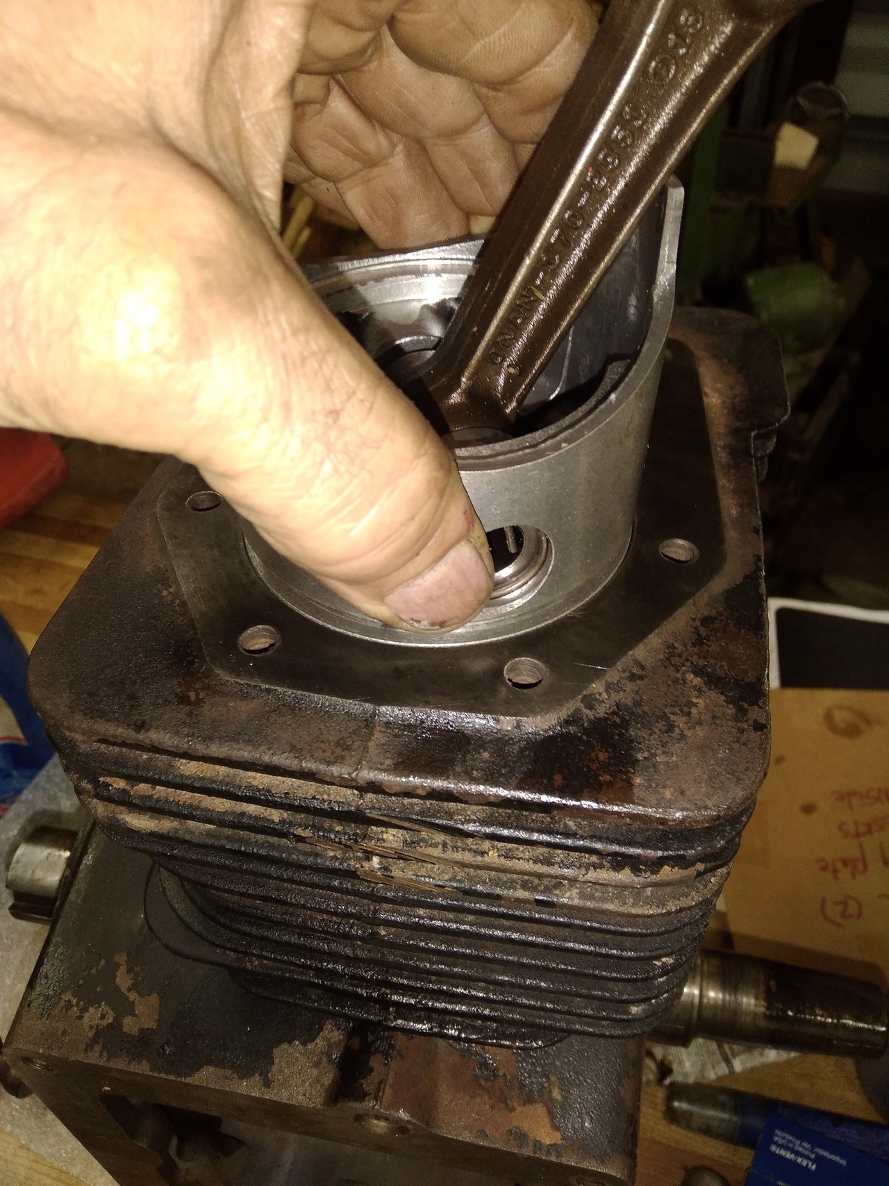 A piston was used to punch the new rings perpendicular to the bore.