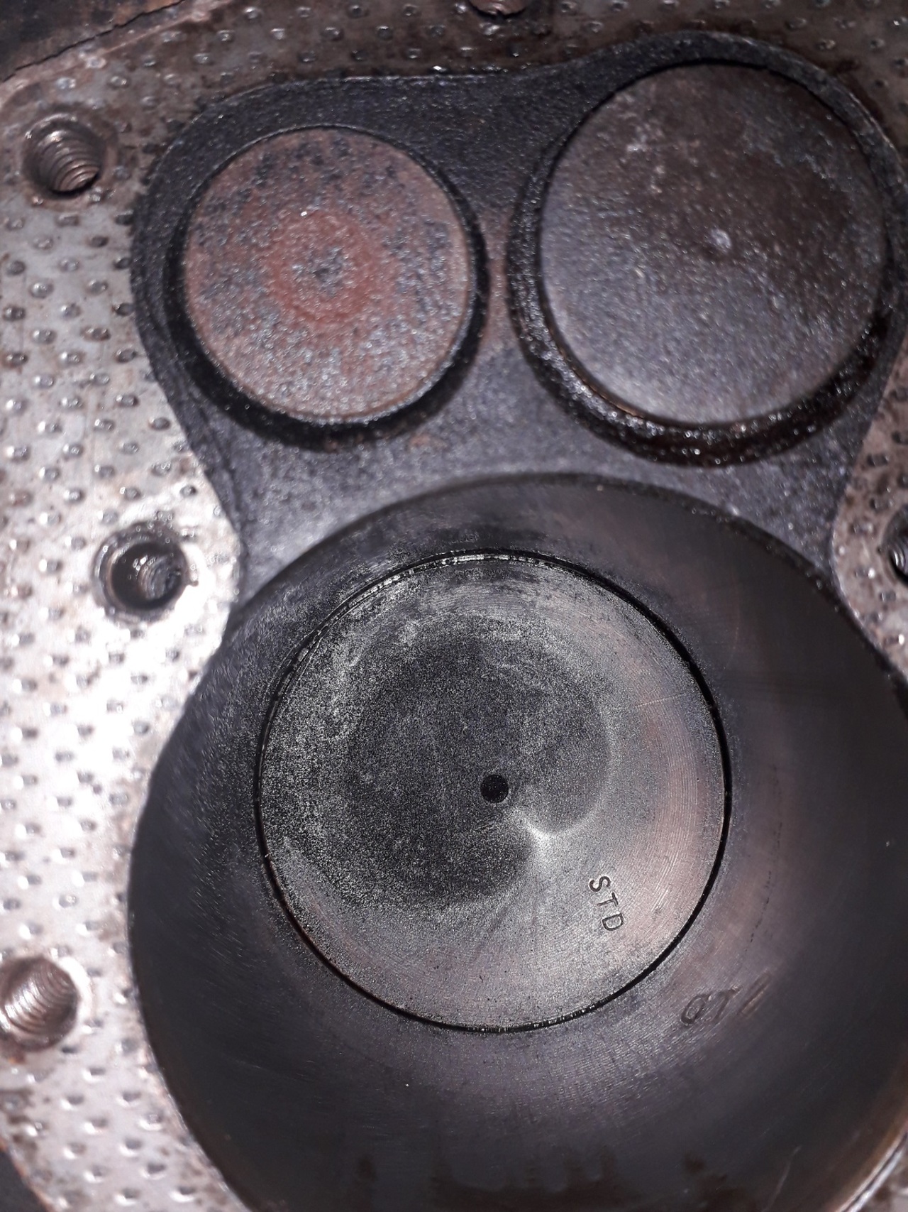 The crank was good so it went back with STD bearings. Top 2 rings are gapped 180 degrees and parallel to the crank shaft. Oil rings are at 90 degrees to the crank. I will be doing new guides and valves and lapping the seats.